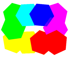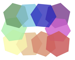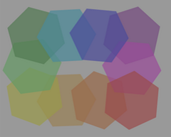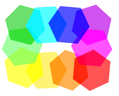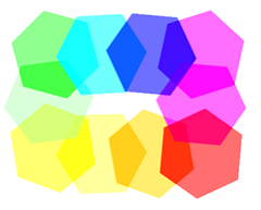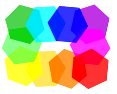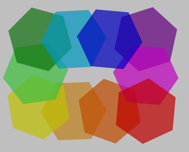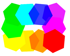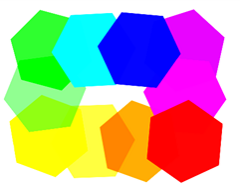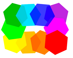 I created an image of a series of colored, overlapping, somewhat translucent hexagons in a color wheel arrangement. Note that where the hexagons overlap, the colors mix to form other colors that are mixes of adjacent colors. Pay attention to that detail! The colors I used are intentionally vivid and bright and do not match anything in the real world, meaning that the red doesn’t match a Coke can and the blues aren’t representative of sports teams where if it’s a little “off,” it’s very noticeable. If that yellow were to print a just a tiny bit more orange or just a tinge more green, it would still give the same impression and the colors would look great when pressed on a blank. It is a PNG with a white background (by design).