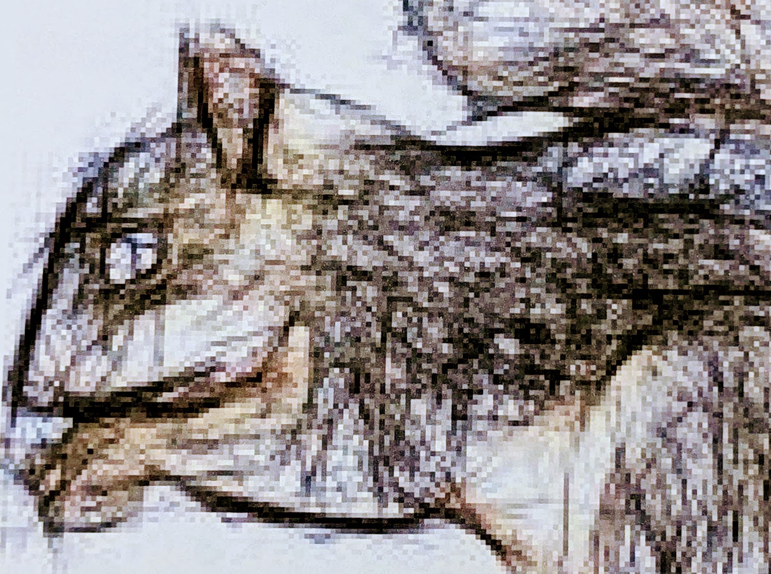 Above is a portion of a photograph of the logo printed at 8″ wide (if I showed the whole thing, it would shrink it down to fit the screen, which reduces the impact of pixelation, so I cropped it to show it at full scale). Your screen may shrink this a little (or maybe a lot), but you can see that it’s badly pixelated. This isn’t my furry little squirrel!