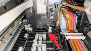 TIP 3: View the linked video (above) to see how to unlock the printhead. There’s a small, white plastic lock on the left side of the printhead that needs to move out of the way to allow the printhead to move freely. The picture shows the location of the lock as seen from the left side of the printer looking down towards the right side, though the printhead has een moved to the left side of the printer and isn’t in view. There are several ways to unlock the printhead lock, the video show how to turn the gears on the left side of the printer to unlock it easily.