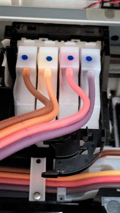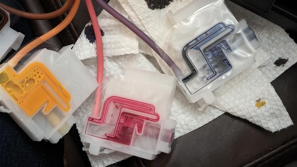 Since colors are used at different rates, it’s probable that one color will fail first, but the same conditions that happened to the first color have happened to all of them, so the others are not far behind. This leads to a frustrating series of colors going out, first yellow, then black, then magenta. Sometimes it happens while your fixing the first color, sometimes it devilishly waits for a time after you think you have it fixed. If you didn’t know about the problem with air in the dampers, you’d be convinced that your printer is dying, or maybe that your ink is bad, or there’s some other horrible reason your printer is suddenly clogging so much. The reality is none of that is true. It can also happen that you go to print one day, whether the printer has been sitting for months or just a few hours, and many colors don’t print, or possible no colors are printing. It’s the same problem: air has infiltrated the damper and the air is blocking the flow of ink. It’s clogged, but not with a clot of dried ink that needs to be broken up, it’s air that needs to be removed.