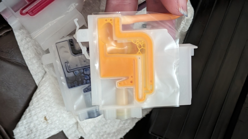 You can do purge pages to get the air out, too. Plan on printing 10-50 pages or more. You can do the four-color kind or the single color, it really doesn’t matter. It will eventually “print” out enough air to get the ink flowing again. However, if you’ve noticed the warnings that low ink can damage the printhead, that’s exactly the problem when you’re printing purge pages with no ink flowing. I don’t recommend doing very many as it can delaminate the printhead and cause it to leak ink or the printhead to not function. There is no fix for that; DIY fixes require tearing down the printer *if* you can find a replacement printhead.