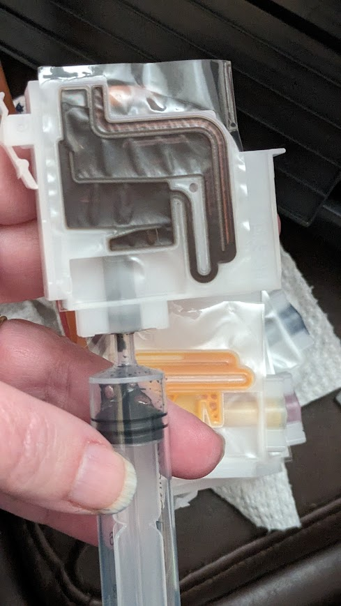The most efficient method to get the air out is to open the printer and use a syringe to draw out the air. The outlet where it connects to the printhead is designed to be the perfect size for a syringe and you can get all the air out easily. The pic below shows how the syringe fits into the damper (it also shows that black ink is very dark and photographs poorly — you can’t tell from the pic if it’s full of air or ink! It’s easier to see in person).