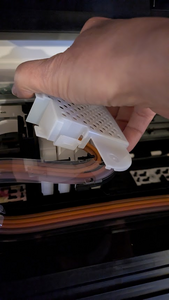 The printhead has a white cap with ventilation holes. In this picture, the cap has been taken off to show the dampers in place on the printhead. The ink supply lines attach at the top of each damper.
