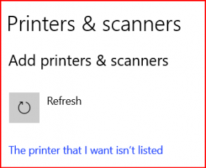 - Click on Add a printer or scanner. It’ll think a bit and show a progress bar (should take only a few seconds), then possibly display some other printers and a link titled The printer that I want isn’t listed. Select that link.